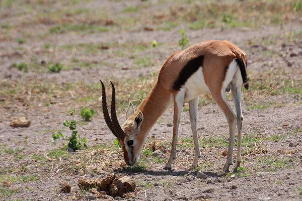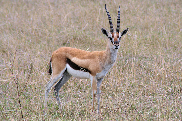 The Thomson's Gazelle is a small gazelle similar to the Grant's Gazelle. It has a brown coat with with white underparts and a wide black stripe across its side.