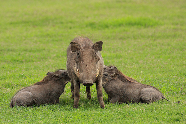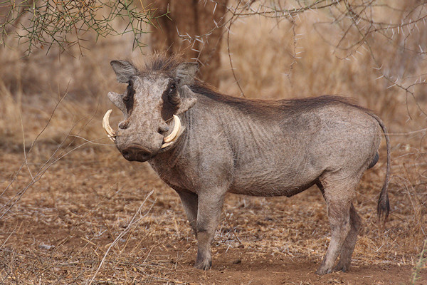 The Warthog is a member of the pig family. It has two pairs of tusks and derives its name from the wart-like lumps on its face which help to protect its eyes when fighting. Both sexes have tusks but the male tusks are larger.
