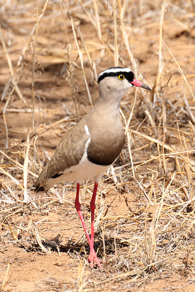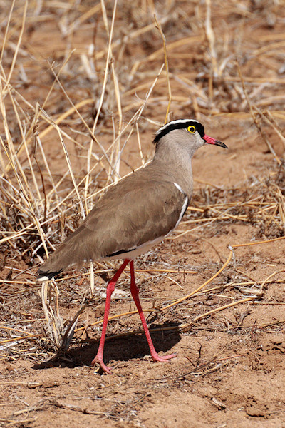 The Crowned Plover, also called Crowned Lapwing, is a wading bird. The back, wings and throat are brown and it has a white belly. Its most striking feature is its black crown with a white stripe.