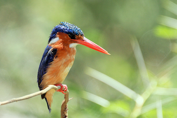 The Malachite Kingfisher is one of the most distinctive kingfishers. It has bright blue plummage on its head and wings. The underparts are orange and it has a large red beak. There are small white patches on the neck and throat. The legs are red. The sexes are similar.