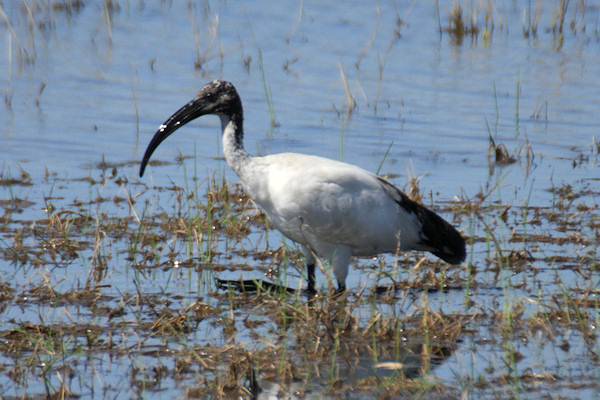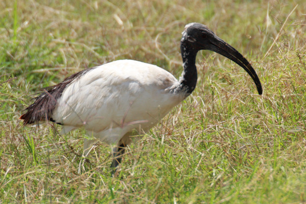 The Sacred Ibis has a bare black head and neck with the distinctive long curved beak. The body and wing feathers are white with black tips. The legs are black.
