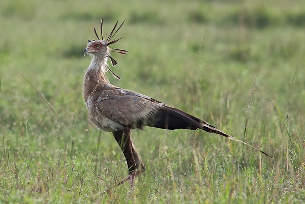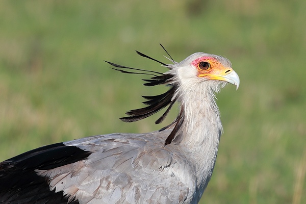 It has black and grey plummage with long tail feathers. It also has long black feathers on the back of its head which can be raised into a crest. Its face is featherless and red and it has the strong curved beak of a raptor. Its legs are long with black feathers covering the thighs. The sexes are similar.