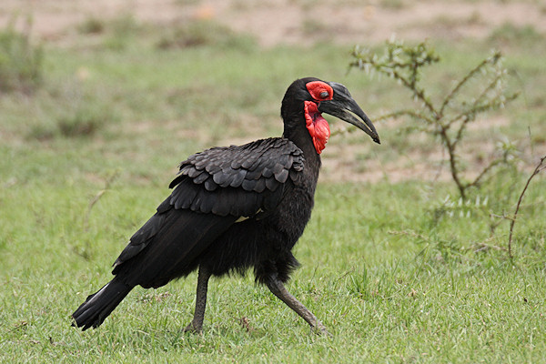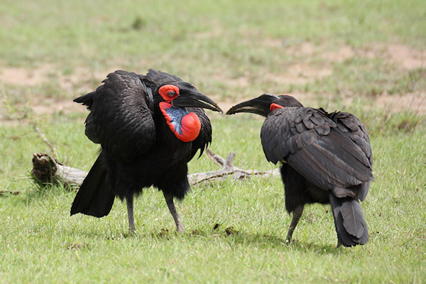 The Southern Ground Hornbill looks rather like a turkey but with black plummage, a red face and red wattles on the throat. The female (the bird on the left of the pair) has a patch of blue in the centre of the throat wattle.