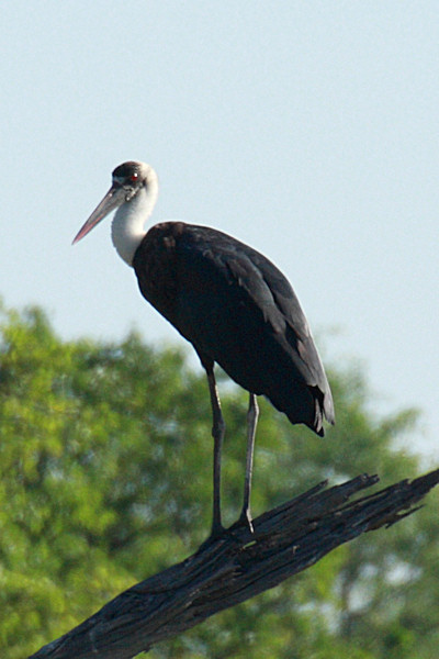 It has dark brown/black plummage with a white neck and black head. The eyes are red.