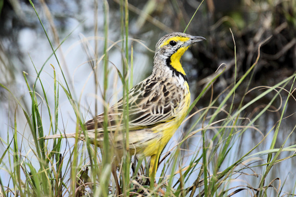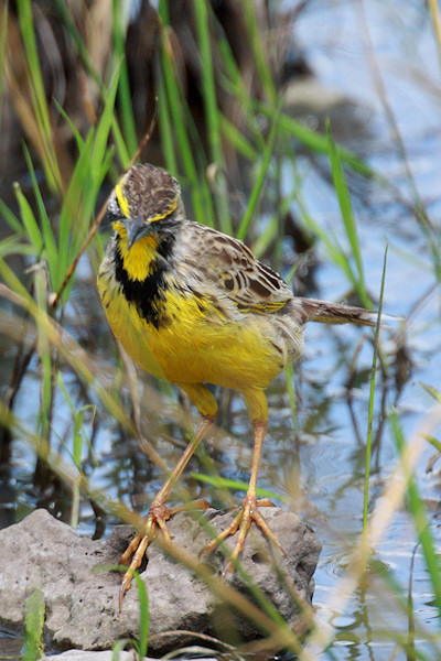The Yellow-throated Longclaw is easy to identify with its bright yellow throat and underparts and a black bib. The wings and upper parts are streaked brown/grey.